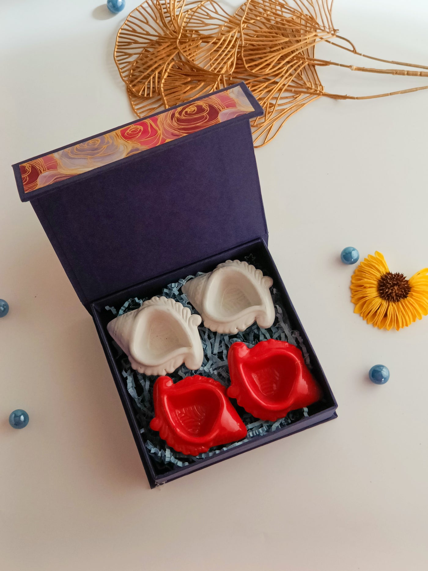 A festive hamper featuring 4 beautifully crafted shankh-shaped diyas in vibrant hues, presented in an elegant red box. Perfect for gifting and adding a touch of tradition and charm to your Diwali celebrations.