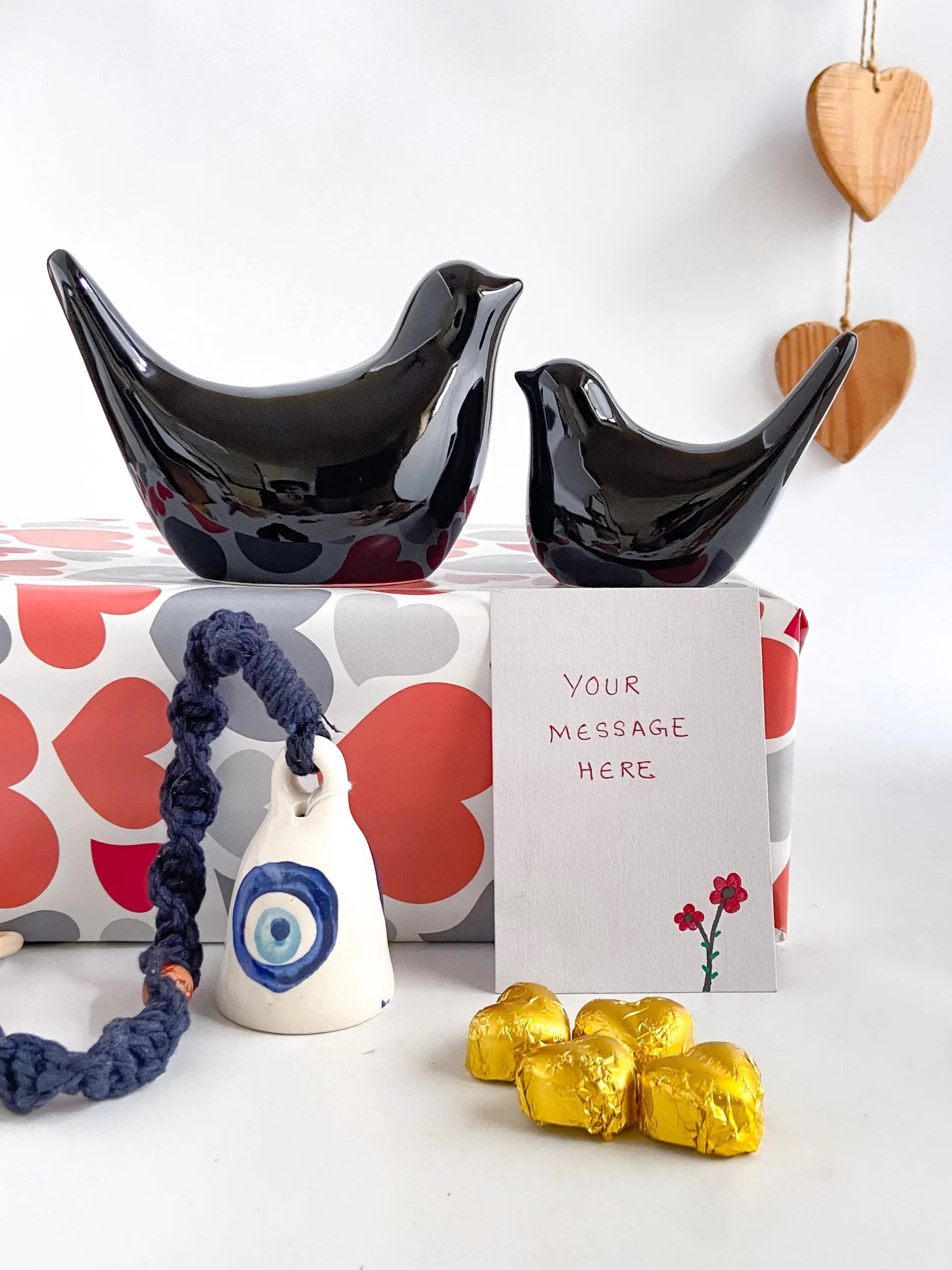 A thoughtfully curated gift set that blends warmth, love, and a touch of handmade charm. This hamper includes elegant black ceramic bird figurines symbolizing nurturing love, a handcrafted Evil Eye bell for protection, golden heart-shaped chocolates, and a blank floral card to pen your heartfelt message. It’s the perfect way to say congratulations on a new home or any important milestone of your loved ones journey.