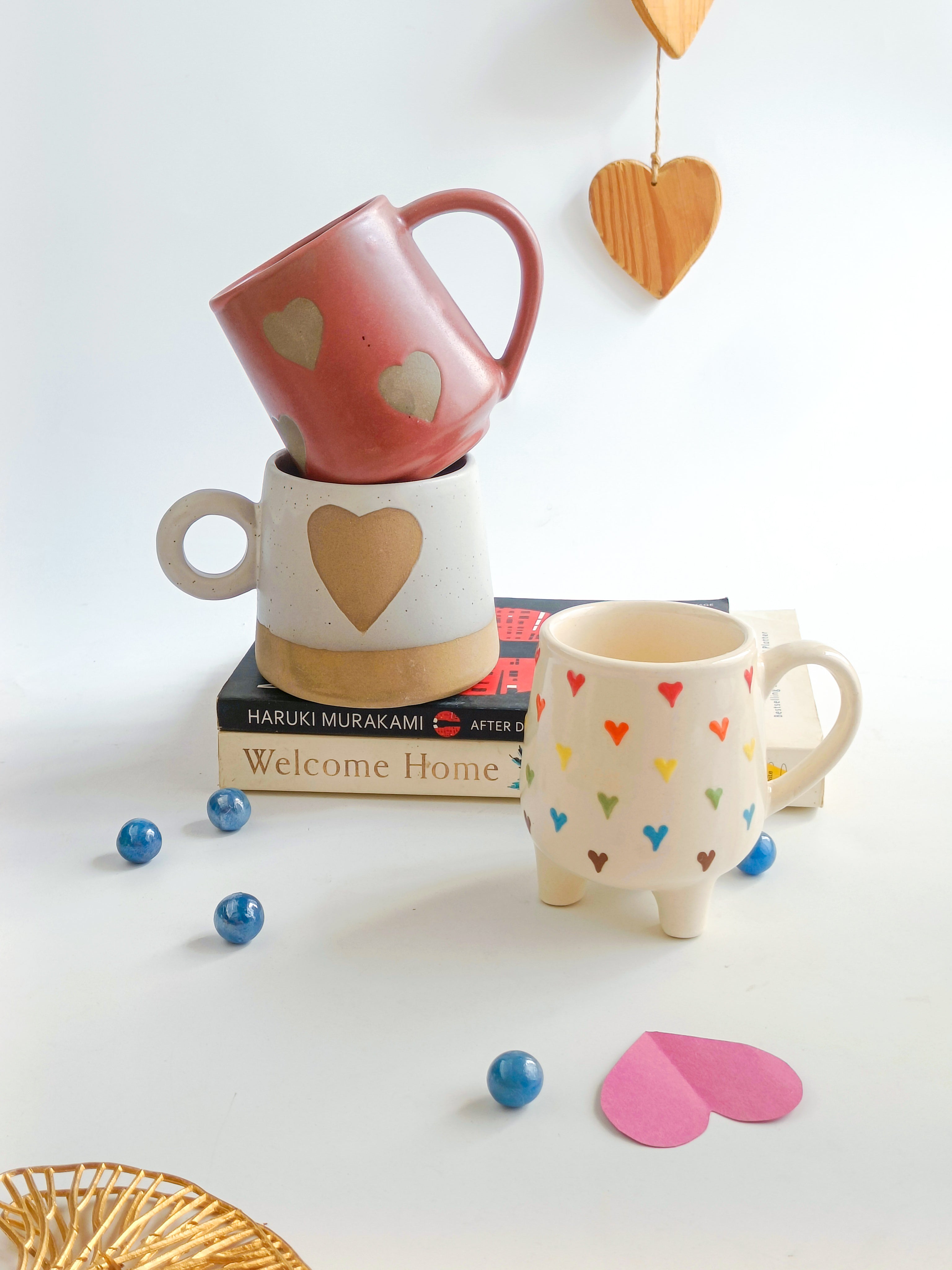 - Dusky Heart Mug – Understated and earthy, this mug features a delicate heart accent, perfect for those who adore subtle details. Height: 3.5″, Diameter: 3″, Capacity: approx. 250 ml.