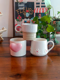 Delicate, dreamy, and full of heart — the Whispers in White trio brings together three handcrafted ceramic mugs, each layered with personality atop a clean white canvas.