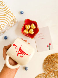 Price mentioned is for 1 mug, 1 charm, and 4 pieces of chocolate.