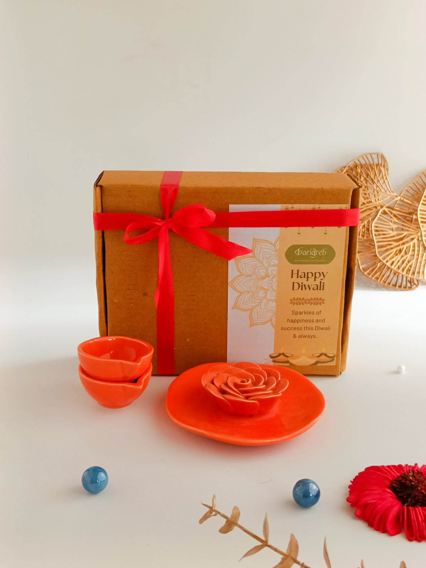 Bring home a sense of peace and vibrant tradition with this festive hamper featuring the Floret Agarbatti Stand and two Classic Ceramic Diyas, elegantly packed in a sturdy corrugated box.